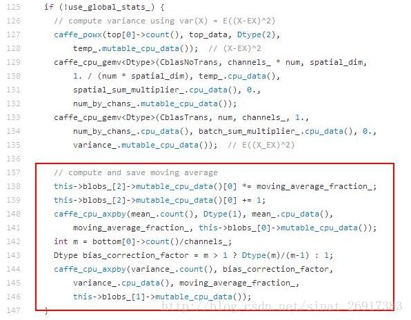 以下代码在use_global_stats为false的时候通过moving average策略计算模型中最终存储的均值和方差: