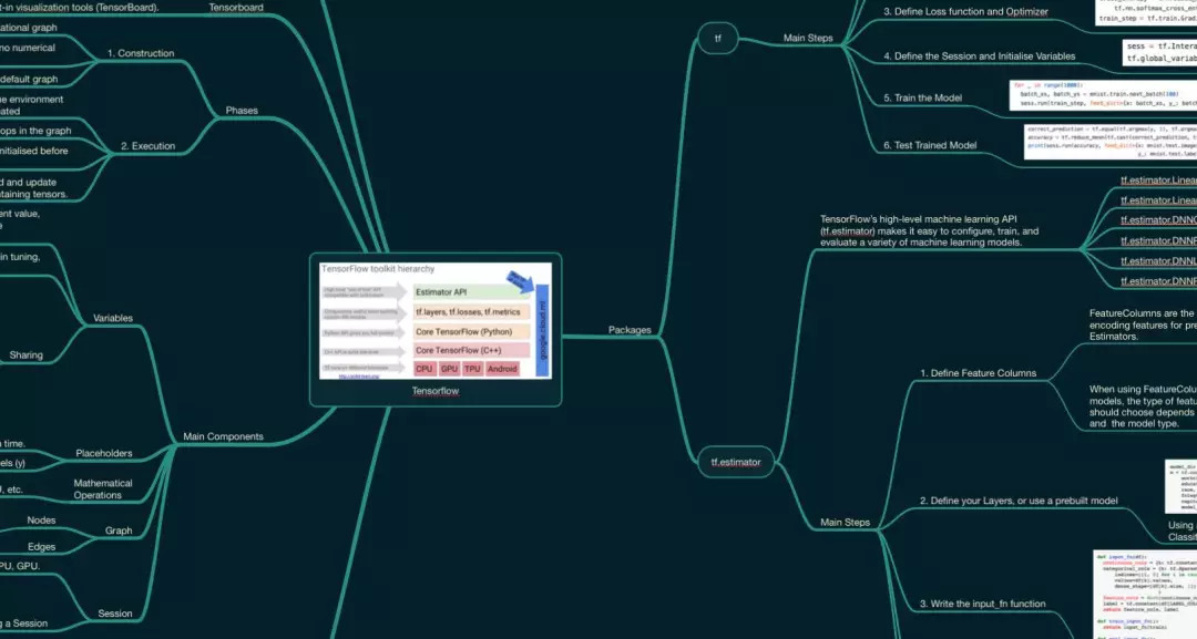 TensorFlow是一个采用数据图模式的开源数据计算包。这个思维导图列出了Tensorflow一些基本的模块以及整体架构。