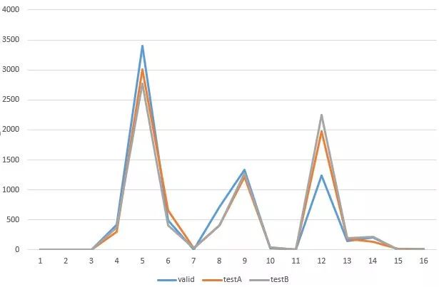 下图为最终的结果从各个模型中抽取的数量分布,从图中可以看到 valid,testA,testB 抽取的分布是大致一样的,这也证明了我们 rerank 方法是稳定且有效的。