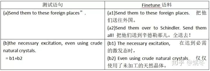 从表格的第一行我们可以看到,测试语句中 Send them to these foreign places” 与微调语料 a1 只有最后的符号不同。而第二行中的测试语句 the necessary excitation, even using crude natural crystals. 为两个微调语料 b1 和 b2 的结合。