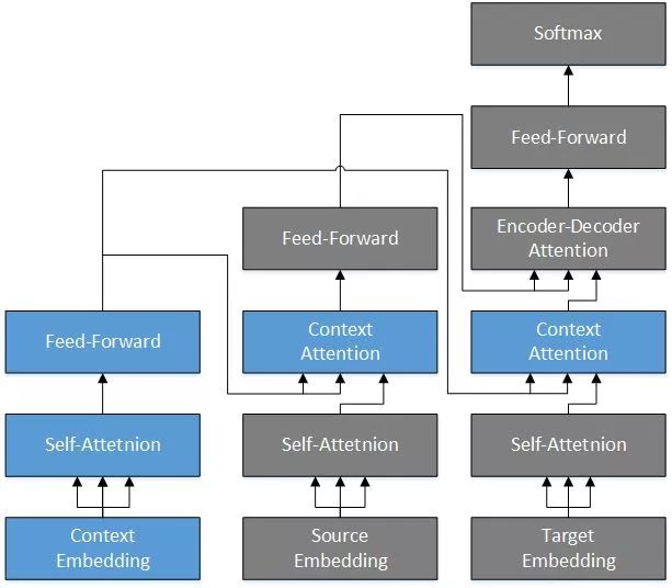 具体细节及实验设置见论文 Improving the Transformer Translation Model with Document-Level Context [3]。该模型在 transformer_base 条件下有了 0.5 个 bleu 的提升。
