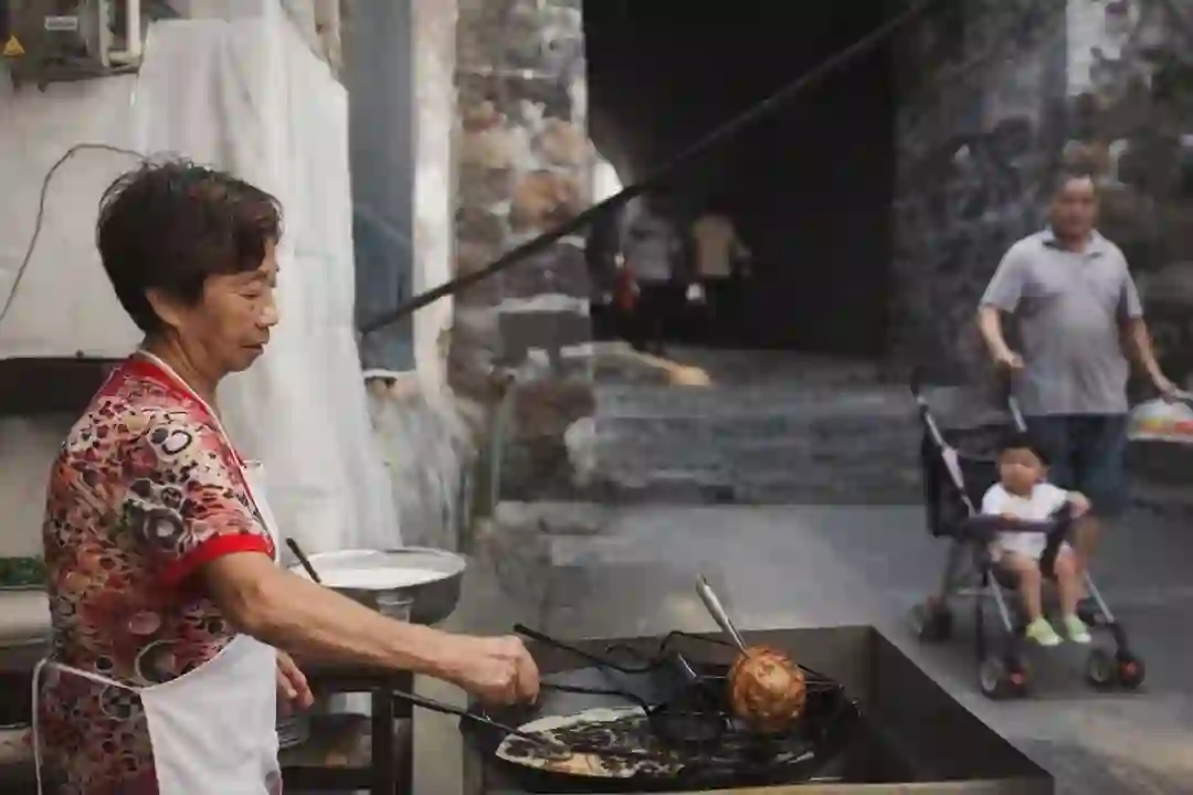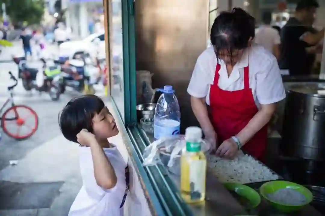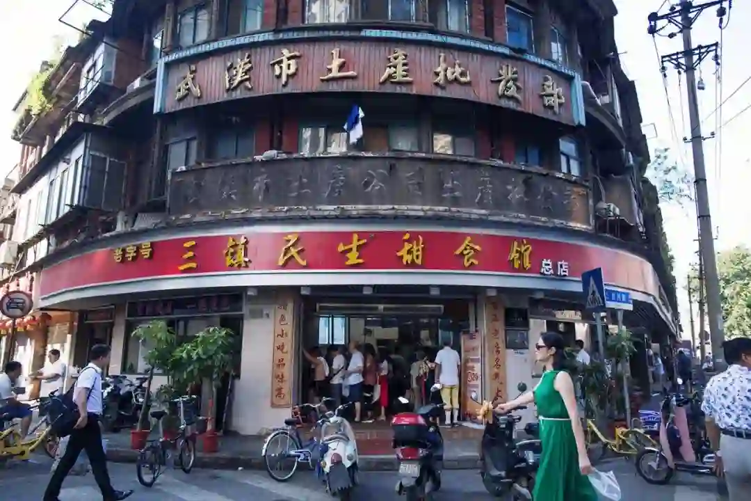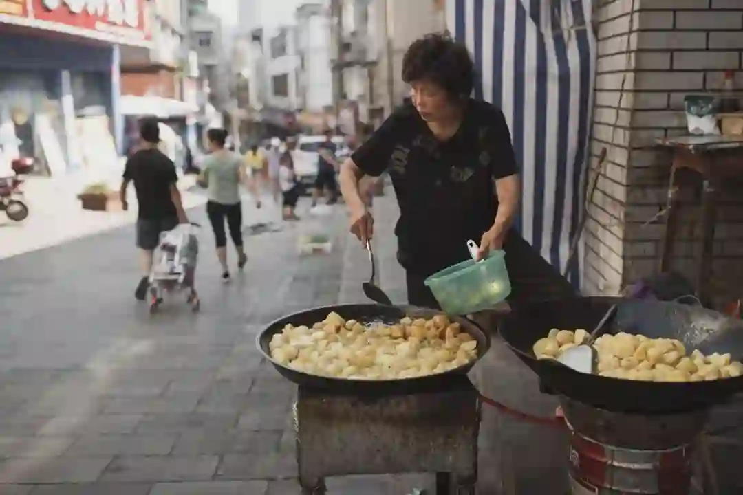 ▲武汉三镇民生甜食馆,衣着入时的女性用竹签串起几个油饼往家里走。武汉人热情而干练,在过早时能充分感受到武汉人的性格特点。