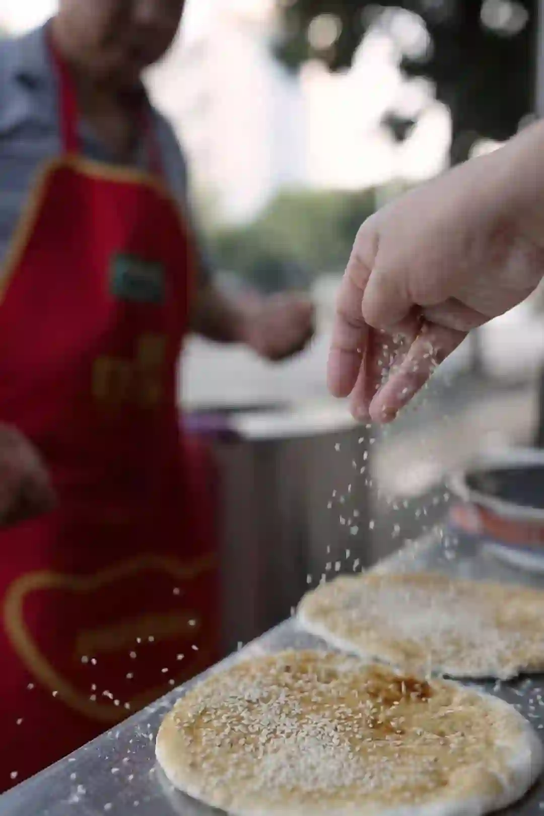 ▲洒满芝麻,等待入炉的土家烧饼