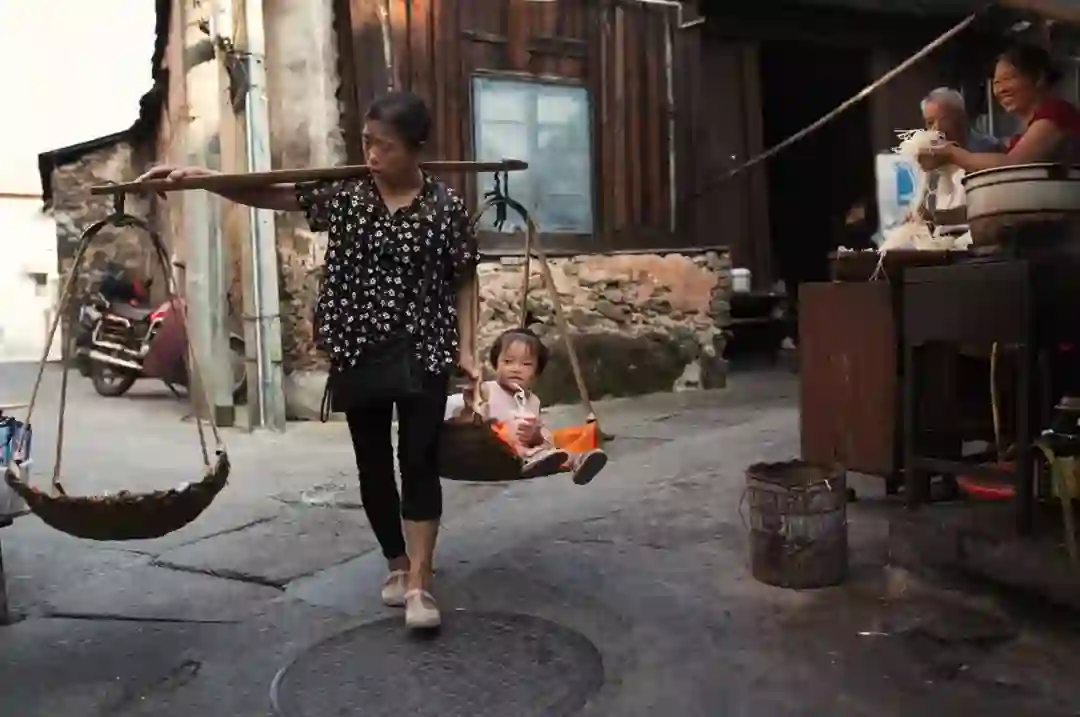 ▲恩施古城里卖完菜的村民,带着孩子买完早餐回家