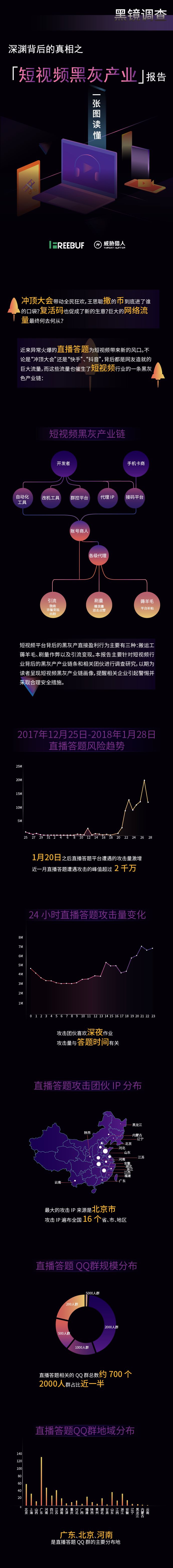 作为黑产系列报告的第二部,本报告从“短视频黑灰产业链”入手,通过对短视频及直播答题行业浅析,结合威胁猎人 TH-Karma 情报中心的亿级情报数据以及十几个短视频、直播答题相关的 QQ 群调查结果,利用数据分析、真实调查等方式,揭秘伴随短视频和直播答题应运而生的黑灰产业链详情,以期为读者呈现短视频黑灰产业链画像。此外,报告中的真实案例也体现出企业运营过程中出现的技术或业务疏漏,需要企业、项目管理者重视产品和业务中的安全问题。同时,也借此为相关决策者提供一定的参考和指导。