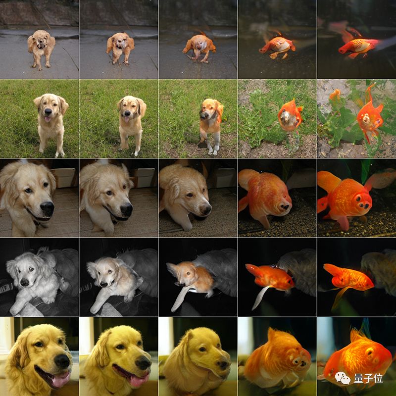 每个生成结果都长这样,每一行是从金毛到金鱼的渐变过程,行数则是样本数量,也就是生成几条渐变。