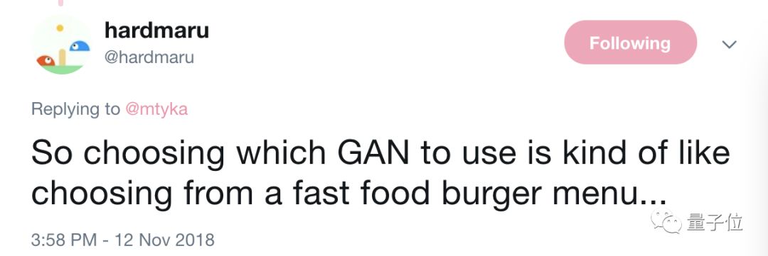 谷歌大脑东京研究员、推特知名科技网红hardmaru就评价说,选择用哪个GAN,怎么跟从快餐汉堡菜单中点餐似的。