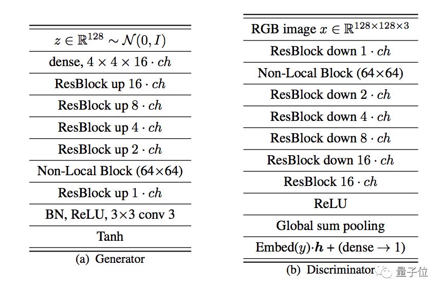 研究人员对GAN架构做出了两处改动适应大规模训练的不稳定性,比如对判别器的通道类型做改动,让每个模块第一个卷积层里的滤波器数量和输出滤波器相等,比如生成器G用了单个共享类嵌入,为BatchNorm层生成每个样本的增益和偏差。