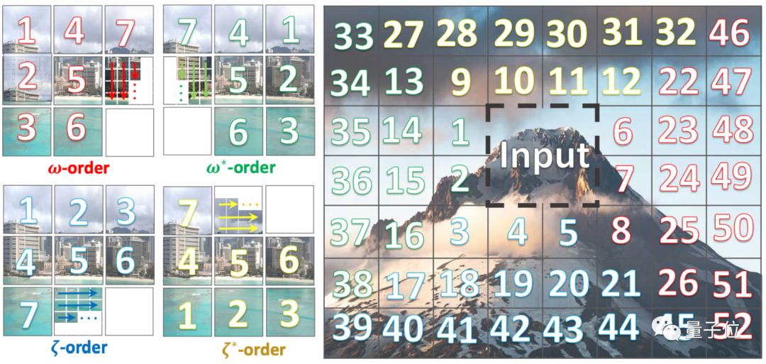 例如,在“补全图像”的过程中,图像推理是一圈一圈向外生成的;而在文本生成图像、或是视频文本生成时,这些推理的顺序又有不一样的变化: