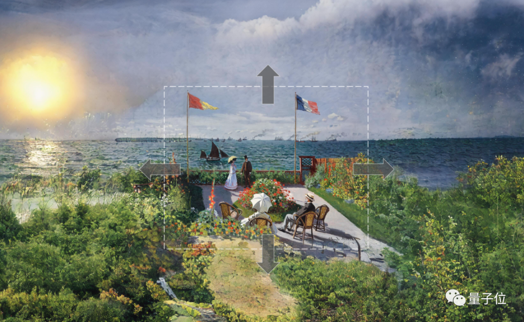 值得一提的是,原画中人物的影子沿着右下方拉去,AI在补充画面的时候,还非常聪明地在左边补充了太阳。