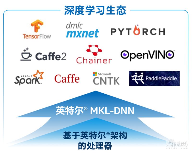英特尔面向TensorFlow、MXNet、PyTorch、Caffe等主流深度学习框架做了优化,设计了MKL-DNN性能增强库,以提升这些框架在英特尔架构基础设施上的运行速度。