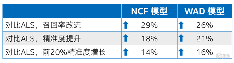 万事达优化推荐服务时用了NCF和WAD模型,从验证结果来看,精准度和召回率均相比ALS模型有明显提升。