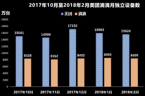 这是从艾瑞数据上整理的2017年10月至2018年2月美团滴滴月独立设备数。我们假设这两部分用户是完全重复的,即滴滴的用户也全都注册了美团,再假设美团多出的那部分用户没有打车的需求(在我们家乡那种小城市,整个县城主城区骑个电动车很快都能逛完,完全没必要打车)。