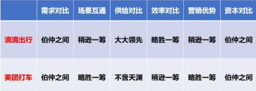 我想在这一章节对美团打车和滴滴出行的竞争做一些对比分析,主要有以下6个方面: