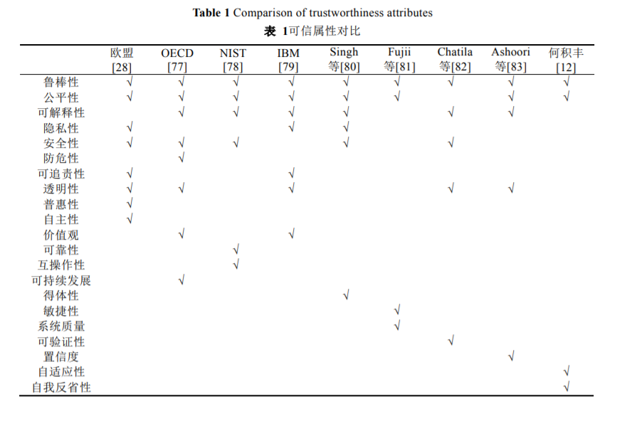 许多学者也对人工智能应用有的可信属性提出了自己的见解。Singh 等认为可信人工智能不应具有偏见, 应保证公平性,模型具有可解释性与透明度、应对对抗性攻击的鲁棒性,系统本身还要做到隐私保护,保证 安全性的同时也要具有得体性[80]。Singh 等对人工智能提出了公平性、可解释性、鲁棒性、隐私性、安全性、 得体性六个可信属性。Fujii 等则认为人工智能系统要保证数据的完整性、模型的鲁棒性、系统的高质量、过 程的敏捷性以及满足客户的期望[81],他们更加强调完整性、鲁棒性、系统质量以及敏捷性。而对于 Chatila 等而言,他们关注的是人工智能系统的透明性、可验证性、可解释性、安全性与鲁棒性[82]。Ashoori 等也提出了影响人们信任人工智能的七个因素[83],分别是决策风险、决策者、训练方法、模型的可解释性、训练和 测试集的说明、社会透明性与模型置信度。这些因素强调了可信人工智能的公平性、鲁棒性、可解释性、透 明性与置信度。我国何积丰院士也提出人工智能应具有鲁棒性、自我反省性、自适应性和公平性[12]。下表 1 中列出了各个不同组织机构和学者对可信属性的见解。这些可信属性从不同的角度提出了对人工智能系统可 信性的要求。从传统软件可信性的角度提出了人工智能系统可信性应满足的要求:隐私性、安全性、防危性、 可靠性、系统质量和敏捷性;从人工智能模型的黑盒特性对其行为结果产生的影响提出了:公平性、鲁棒性、 可解释性、透明性、可追责性、可验证性和置信度等属性;从人工智能要为人类服务的角度提出了可信需求:普惠性、可持续发展和互操作性;从人工智能应具有人的特征提出了:自主性、价值观、得体性、自适应性 和自我反省性。
