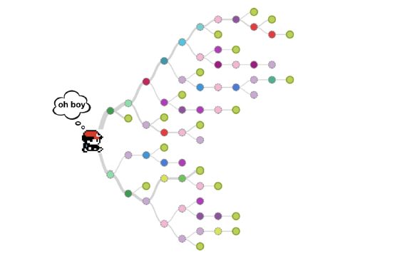 在「马里奥」中,你或者向左走、向右走、跳跃,或者啥也不做。机器需要评估的选择数量少,而且这个分支乘数越小,机器人通过计算能够预测到的未来就越远。