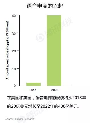 根据Juniper的数据,在美国和英国,语音电商的规模将从2018年的20亿美元增长至2022年的400亿美元。有趣的是,语音电商最热门的三大商品品类都是低价商品:生鲜杂货(20%)、娱乐(19%)和电子(17%)。