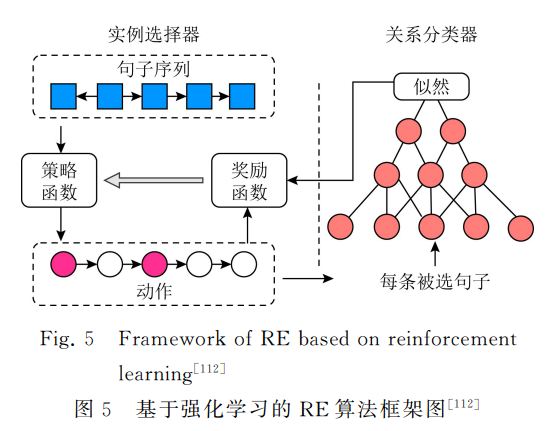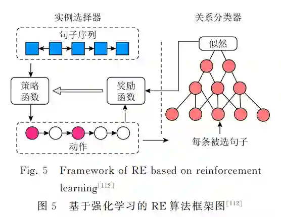 关系可以定义为实体之间或实体与属性之间的 某种联系,关系抽取就是自动识别实体(或实体与属 性)之间具有的某种语义关系.现有关系抽取方法大 多基于神经网络模型[46G54],通过监督学习或远程监 督学习来完成抽取任务.为了降低标注成本,学者们 提出使用远程监督的方法.远程监督方法虽然有效, 但在训练样本中引入了噪声[15].强化学习方法可以 通过知识引导来避免噪声数据带来的影响.基于强 化学习的关系抽取方法主要可以分为3类:1)使用 强化学习模型对抽取结果进行知识验证;2)利用强 化学习模型进行训练样本选择;3)将实体识别与关 系抽取2个任务联合建模,互为增强。