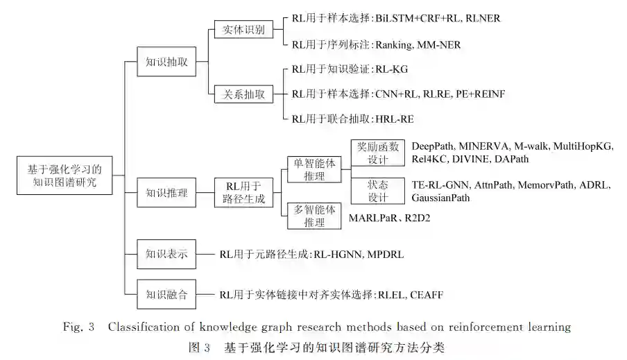 目前,大多数知识图谱的相关方法基于监督学 习,但对数据进行标注费时费力.为了解决标注困难 的问题,有学者提出了远程监督的方法.远程监督减 少了数据 标 注 成 本,但 又 在 训 练 数 据 中 引 入 了 噪 声[15].虽然,目前知识图谱的研究方法在准确率、精 度、召回率等性能上取得了很好的效果,但这些方法 结果的透明性、可解释性、可信赖性等还有待进一步 研究.强化学习方法不同于一般的监督学习, 它把相关问题建模为序列决策问题,近年来在知识 图谱领域得到应用,可以帮助解决远程监督的噪音 问题、知识推理结果可解释性差[105]等问题.本节将 分别从命名实体识别、关系抽取、知识推理、知识表 示、知识融合等5个方面,详细介绍强化学习方法在 各类研究中的进展,如图3所示: