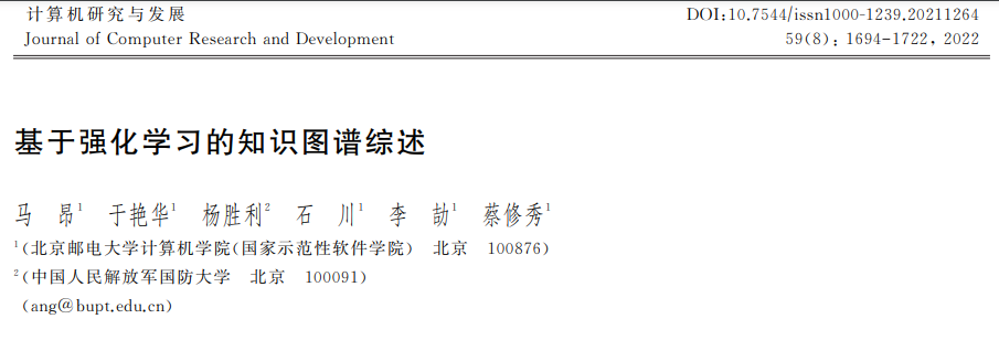 近年来,学术界和工业界对知识图谱、强化学习 2个领域进行了深入研究,有不少分别聚焦知识图 谱和强化学习的综述性文章.文献分别围绕知识图谱的表示学习、知识获取、知 识推理、知识图谱构建与应用、多模态知识融合等进 行综述.文献分别对基于价值的和基于策略 的强化学习、深度强化学习算法、多智能体算法进行 综述.文献对强化学习在综合能源管理和金 融交易领域的研究进行阐述.然而,尽管已有诸多的 知识图谱、强化学习综述文献,但仍缺乏对知识图谱 和强化学习相结合的研究进行系统地梳理和总结的 工作.与现有的工作相比,本文工作的不同主要体现 在2个方面:1) 通过系统调研已发表的基于强化学 习的知识图谱相关研究的论文,全面总结了基于强 化学习的知识图谱研究,包括知识抽取、知识推理、 知识表示、知识融合等研究成果.2) 介绍了基于强化 学习的知识图谱如何应用于智能推荐、游戏攻略、生 物医药、金融、网络安全等实际领域.本文是第1篇 系统介绍该研究方向的综述论文.