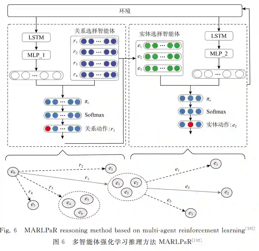 知识图谱通常是不完整的.知识推理是指根据 知识图谱中已有的知识,采用某些方法,推理出新的 知识,包括实体预测和关系预测.传统的推理方法, 例如基于规则的推理[55G56]会引入一些人类先验知 识,专家依赖度过高.目前,大部分知识推理是基于 神经网络模型[58G64].神经网络模型通常更关注于推 理结果,模型可解释性、可信赖性有待进一步提升. 除基于规则、基于神经网络的推理方法外,知识 推理问题也可以建模成知识图谱中路径查找问题, 其中节点代表实体,关系代表边.强化学习智能体根 据当前环境(所在节点)通过策略学习或价值函数学 习,来决定下一步的行动(通常为关系或(关系,实 体)),从而完成推理任务.因此,基于强化学习的知 识图谱推理在学术界和工业界得到广泛研究.基于 强化学习的知识图谱推理方法依据智能体的个数可 以分为单智能体推理方法、多智能体推理方法.多智 能体推理方法指至少拥有2个智能体的基于强化学 习的知识推理方法.多智能体之间存在着一定的关 系,如合作、竞争或同时存在竞争与合作的关系.我 们将分别从单智能体推理、多智能体推理2个方面 进行详细介绍.
