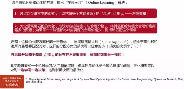 实际上,对于做运筹优化的人来说,我们要对这个问题设计一系列算法,即如何决策才能达到最优目标。经过一系列研究之后,人们提出一些算法。其中一种算法是,观察少量样本,求得每个右端资源j的“合理”价格,在优化里称之为“对偶变量”。当新的需求或匹配产生之后,将匹配分数和所需消耗资源的价值进行比较,看这个匹配是否带来了应有的价值,如果匹配的价值比计算出的合理价格高的化,我们就进行这个匹配,而且选择其中最有匹配使得价值比价格高最多。否则,就拒绝这个匹配请求,这就形成了可以实际运行的算法。