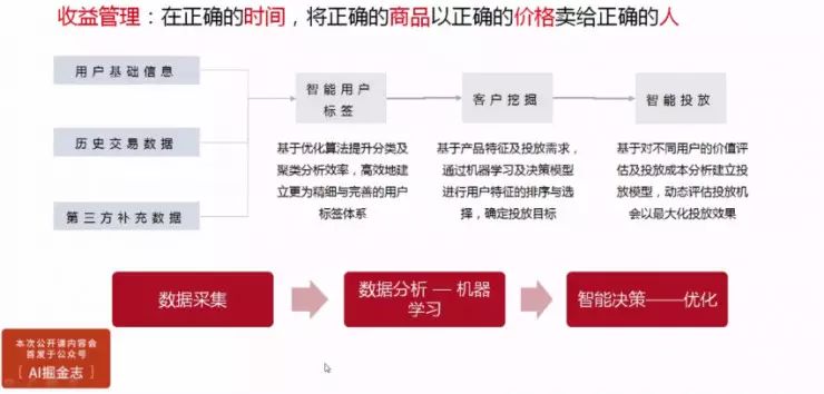 首先是数据采集;然后根据数据对消费者进行分析,比如客户挖掘、对消费者进行标注、分析消费者对价格的敏感程度等;在此基础上进一步决策,比如用什么样的价格买哪些商品、什么时间卖等。实际上这部分与我们开始说的从数据到决策的链条是一致的。