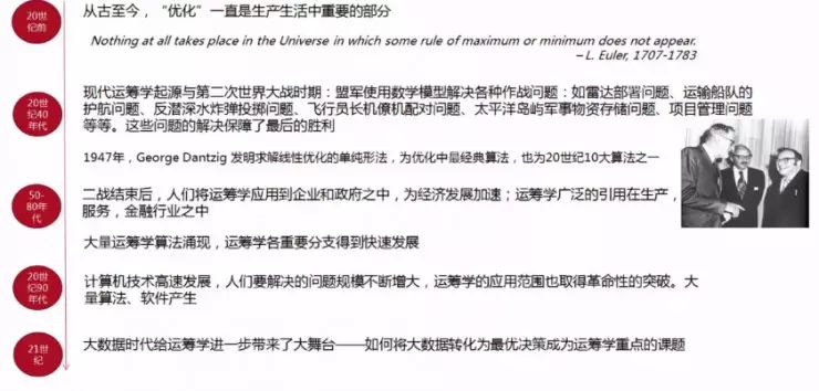 值得一提是, 1947 年,运筹学的泰斗 George Dantzig 发明了一个数学里最经典问题——线性优化问题的解法。如果大家对这种算法比较感兴趣,可以在网上找一找,这个算法被评为 20 世纪的十大算法。战争结束之后,运筹学更多的被用到民用场景中,包括企业、政府、经济发展等,并且也产生了大量的新算法以及运筹学的各个分支。