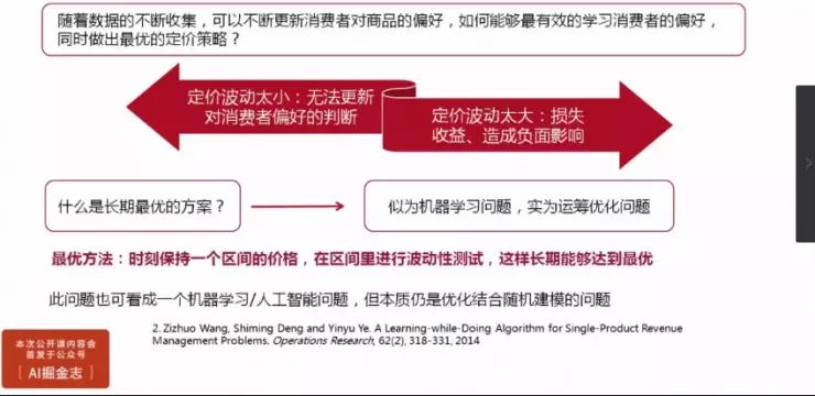 上述组合定价问题可以看做静态问题,在实际中我们经常遇到动态问题。一开始,我们对消费者的偏好不是非常了解,希望通过动态定价、数据收集来了解消费者对商品的偏好、或学习消费者的行为,这就涉及如何动态定价的问题。我们要确定到底要通过多少数据点、怎么设计这些价格以学习消费者行为,同时不能由于定价波动太大造成收益损失、或对消费者产生负面影响,我们要确定什么样的方案是长期最优方案,既能学习到消费者对商品的偏好,又能够获得最大收益,这个可以认为是机器学习问题,也可以看做运筹优化和机器学习结合问题。