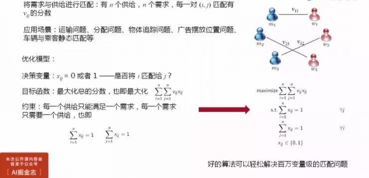 在静态的匹配问题中,我们的目标是供给与需求如何匹配以最大化匹配总分数,这样的问题实际上就是典型的优化问题。我们按照刚才说的决策目标和约束,把它写成优化问题。