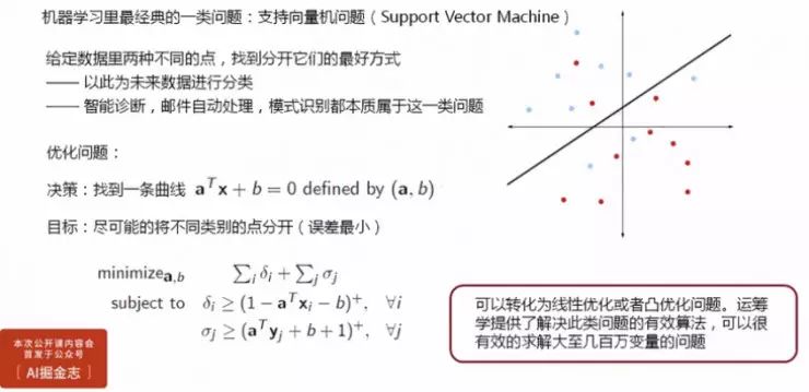 很多时候,机器学习本身的核心也是运筹优化的一部分。机器学习中一个非常经典的问题:支持向量机问题,简称 SVM 问题。