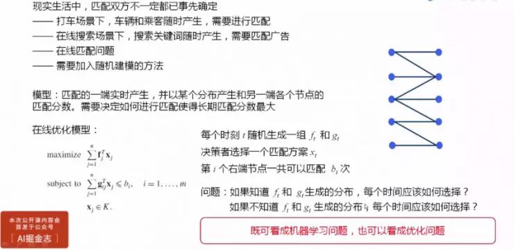 这个问题就比静态匹配问题复杂不少,但我们仍然可以把它写成优化问题形式,只不过在这类优化问题中,系数不是事先给定而是动态生成的,我们可以用多种方式假设,比如这些系数可能是按某种概率分布生成的,甚至我们可能都不知道这些系数分布,只知道出现的顺序是随机的。我们可以有不同的假设,但在每一个点产生之后,我们要决定如何进行分配,是分配给某资源?或不匹配这个点,这就是实际中做决策的问题。