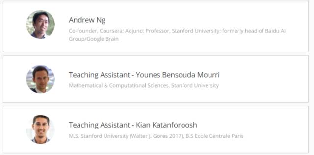 目前 5 堂课里的前 3 堂已经就绪,剩下两堂仍需要几个星期的时间剪辑制作。”吴恩达告诉 PingWest品玩,“我本人会出镜授课。”课程也会有两名助教支持。两人分别为 Kian Katan 和 Younes Mourri,前者还是斯坦福 2016 年工程学院的最佳助教。