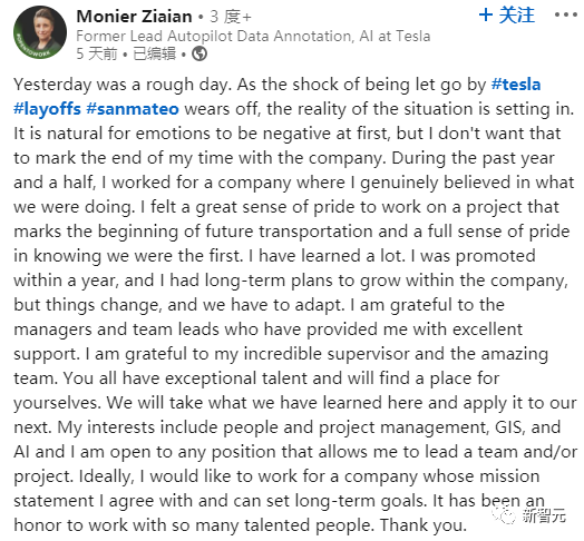 已经是特斯拉「前」自动驾驶数据统计与人工智能主管 Monier Ziain在帖子中表示,「能与这么多才华横溢的人共事是一种荣幸」。