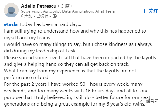 来自特斯拉自动驾驶部门的一位工程师Adella Petrescu写道,「这是我做过的最困难、最耗时、压力最大的工作,但这份经验是用什么也换不来的」。