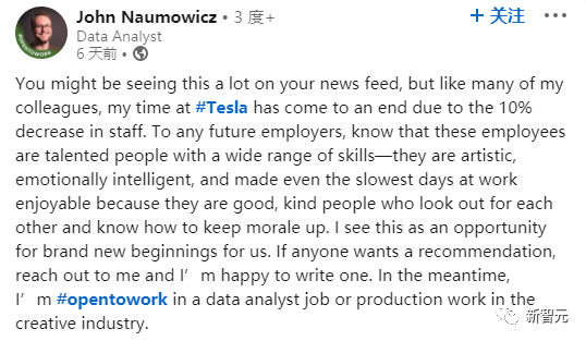 来听点有意思的,特斯拉一些被裁的员工在领英发帖称「尽管他们被特斯拉解雇了,但他们赞同马斯克对电动汽车的未来规划,并很荣幸为之而努力」。