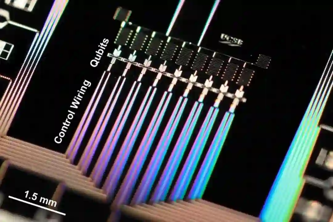 设备:9比特阵列。这是设备的光学显微照片。灰色区域是铝,黑色区域是铝被蚀刻去定义特征的地方。其他颜色用以区分读出电路,量子位,耦合器和控制线。