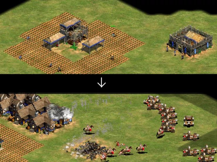 以帝国时代II为例来看,我们可以在第一张图片上看到智能体决定建造一个营房并专注于收集资源。因此,在第二张图片中(几小时后),敌人摧毁了我们的营房,因此我们拥有大量的资源,但我们无法建立一支军队,所以我们死了。