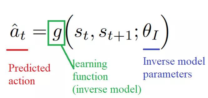 要学习这个特征空间:我们使用自我监督,在智能体逆向动态任务上训练神经网络,给定其当前状态和下一个状态(st和st + 1)预测学习体行为(ât)。