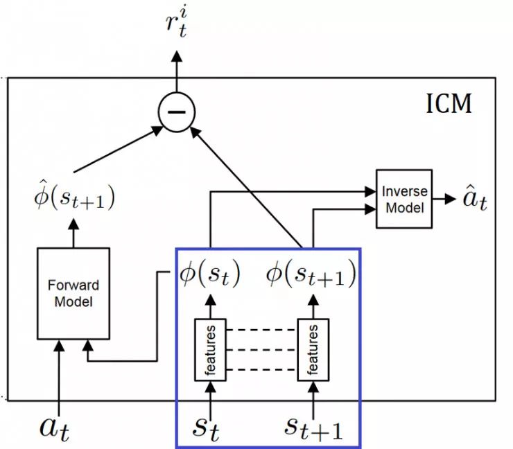 反向模型(蓝色):将状态st和st + 1编码到经过训练以预测动作的特征向量phi(st)和phi(st + 1)中。