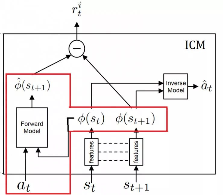 正向模型(红色):将phi(st)和at作为输入,并且预测st + 1的特征表示phi(st + 1)。