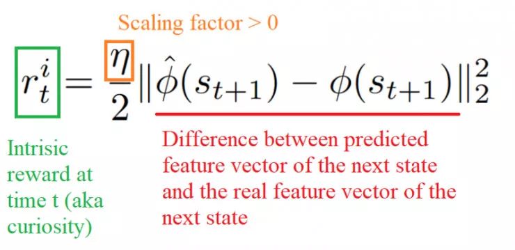 然后从数学上讲,好奇心将是我们预测的下一个状态的特征向量与下一个状态的真实特征向量之间的差。