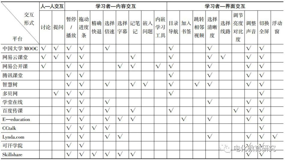 为进一步探究在线开放课程中交互设计应用现状,本研究在对在线开放课程交互设计进行梳理的基础上,精心挑选了国内外十多个有代表性的学习平台,如“中国大学MOOC”“网易公开课”“多贝网”“E-education”“CCtalk”等。基于上文中提出的交互形式的分类框架,对当前主流的在线学习平台中视频课程存在的交互形式进行整体的梳理分析和归纳总结。各平台在线开放课程中交互形式的梳理结果见表1。