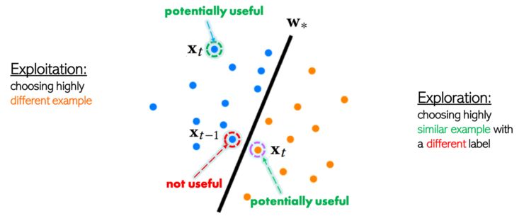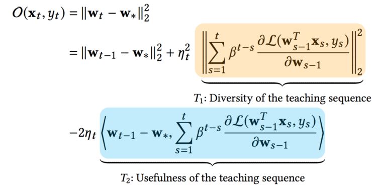 在 exploitation 的教学场景下,teacher 会推荐跟 xt-1 特征非常不同的教学样本 xt。因为 xt-1 的有效性比较低,同一个类型(class)的但是特征(feature)非常不同的样本可能会有比较高的教学有效性。