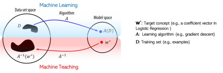 为了充分利用 worker 的学习能力,我们提出了一个基于机器教学(machine teaching)的众包教学框架 JEDI。首先,我们会先介绍什么是机器教学?机器教学其实是机器学习的反过程。如图 6 所示,如果给予一个数据集和一个算法(e.g. SVM, Logistic Regression),机器学习的目标是在模型空间(model space)里学习一个概念(concept)。然后,对于机器教学,目标概念(target concept)和算法是已知的,最终的目标是找到最优的数据集。关于数据集最优的定义可以很多元化,e.g. 数据集规模最小,学习速度最快,等等。