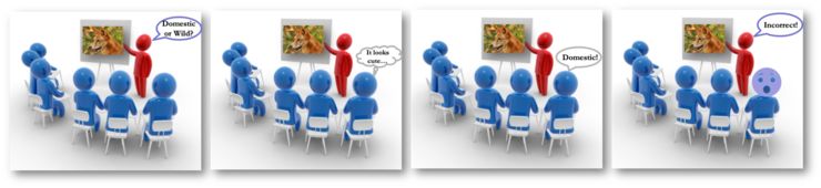 然而,现在常用的方法都忽略了一个很重要的事实,那就是:相比于机器,人类是非常擅长学习一个新的概念(concept),而且可以很容易的将所学的概念很好的泛化并且转移到相似的问题中。图 5 中,人类可以通过看一些插画展示从而学会如何正确标注家猫和野猫的图片。因此,一个更有效的使用众包标注的方式其实应该是在监督 worker 标注的同时对他们进行教学(teach)。