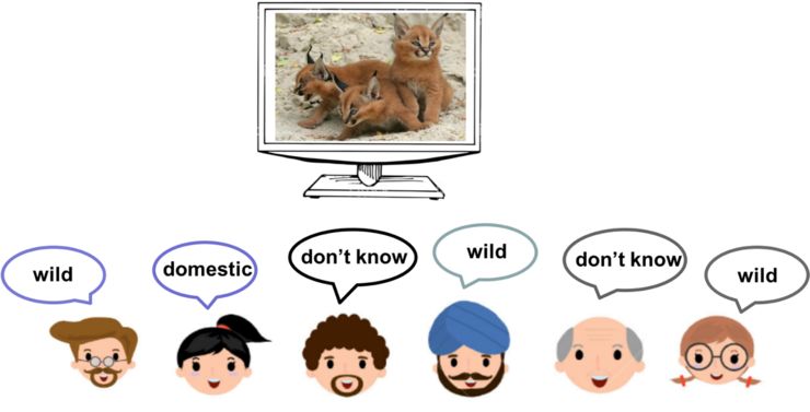 然而,很多时候,图片标注也需要一些专业知识。图 4 中的猫,对与一些 worker 来讲,就不是很好辨别这只猫是驯化过的还是野生的。比如说,和动物打交道比较多的 worker 就可以相对容易的解决这个标注问题,但是一个不太有经验的小女孩就可能给出错误的标签。因此,对于一个特定的标注问题,worker 和 worker 之间有着标注能力的差异,这种差异也会在标注的时候在他们给出的标签上体现出来。这种差异往往会对众包标签融合的算法带来一些挑战。