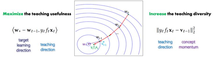 Teacher 估计 learner 的学习进度,根据 learner 之前的标注反馈得到上一次的学习概念,然后 teacher 向 learner 推荐一个新的样本进行教学。