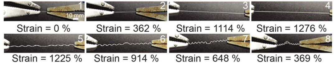 使用两种不同的聚合物粘合在一起,分别是一种非常易拉伸的环状共聚物弹性体和一种更硬的热塑性聚乙烯,MIT研究人员制造了一种纤维,当拉伸到其原始长度的几倍时,自然形成一个紧密的线圈,与黄瓜产生的卷须非常像。