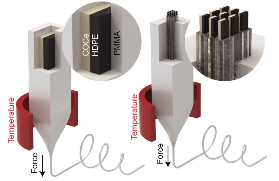 研究人员使用纤维拉伸技术将两种不同的聚合物组合成单股纤维。该过程的关键是将两种具有非常不同的热膨胀系数的材料粘合在一起,这意味着它们在加热时具有不同的膨胀率。